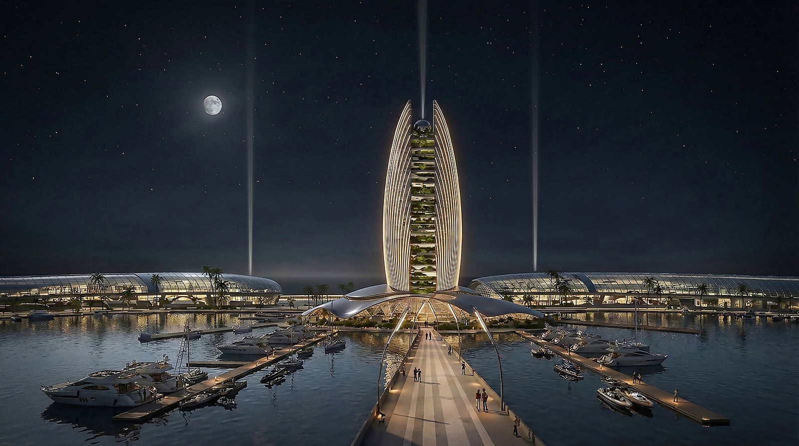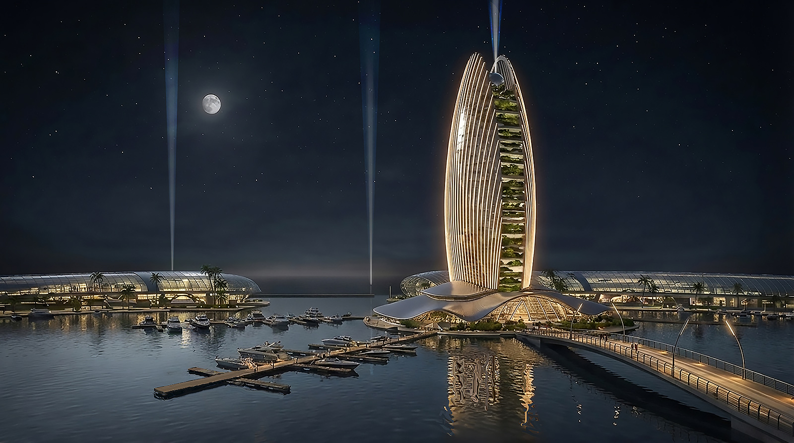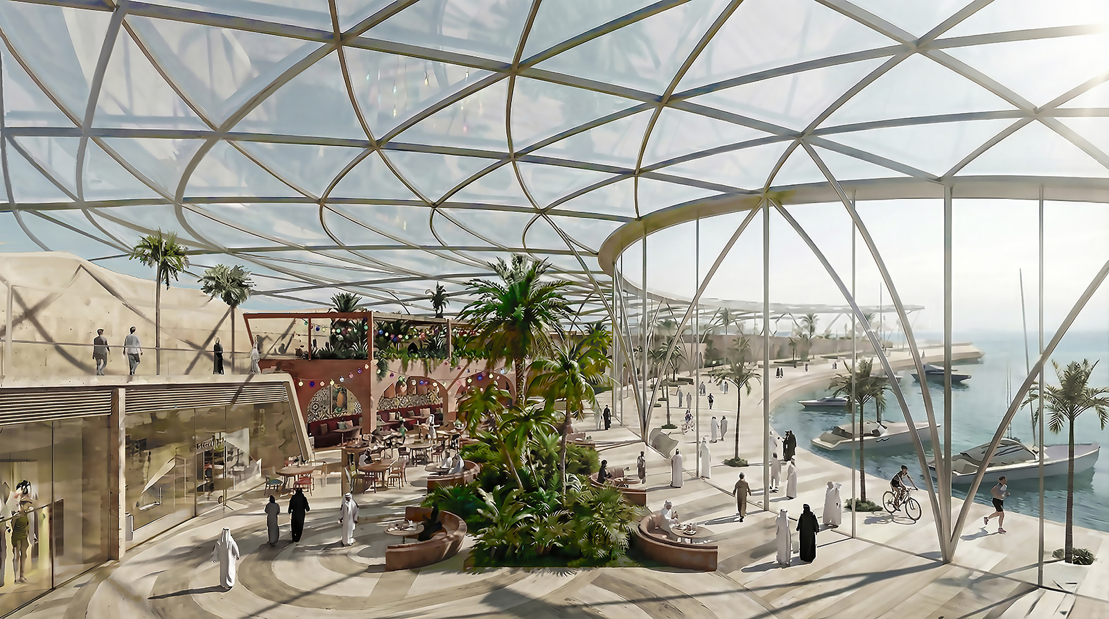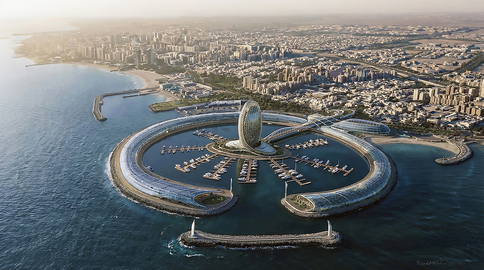 Al Fintas is designed to be the heart of Kuwait City, revitalizing the Kuwaiti coastline with its size, iconic design, and multifaceted program. This new marina and waterfront will offer unique public destinations accessible from both the sea and the city, catering to Kuwaiti people and yacht owners with diverse functions, unique shopping, and entertainment facilities under a continuous transparent roof. The project includes approximately 1,200 berths and a luxury hotel.
