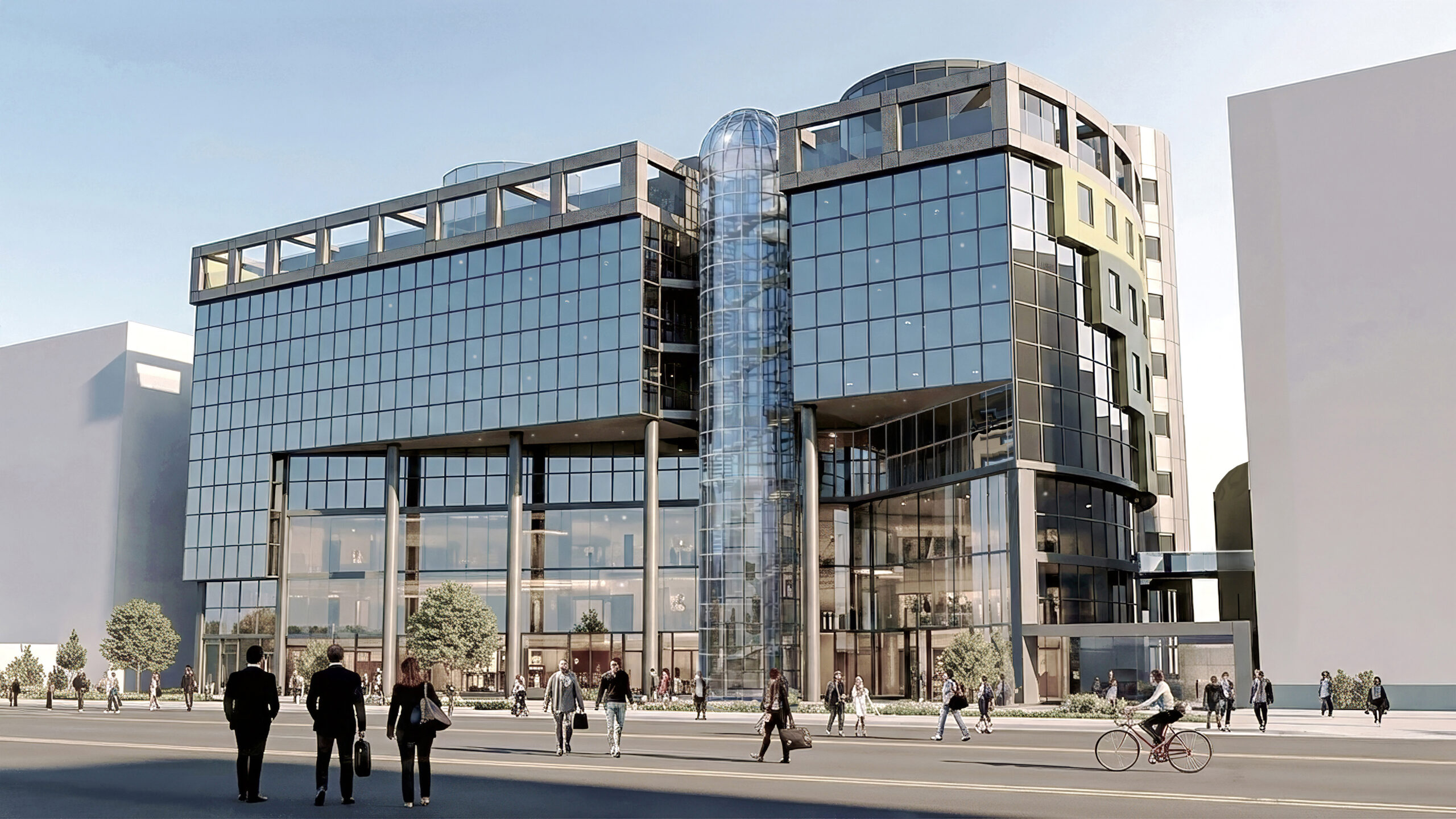 The interior space of this business centre is designed around a circular atrium providing access to the main shopping area. The design features a vertical glass transportation system which provides access to the offices and a large terrace with café and restaurant. The design also includes a large underground car park.